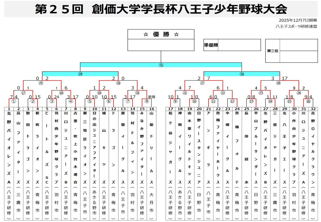 第25回 創価大学学長杯八王子少年野球大会 (2026/1/25 10:00 滝ケ原グランド)
